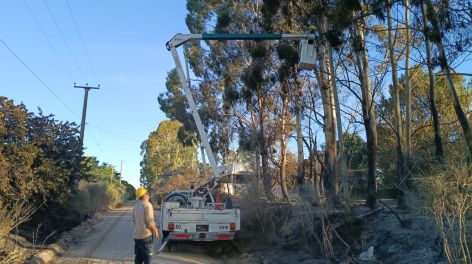 Desde el primer momento trabajaron en el lugar dos cuadrillas del área de Redes, con el apoyo de camiones grúa, realizando tareas de aseguramiento, recambio de estructuras y normalización del servicio.